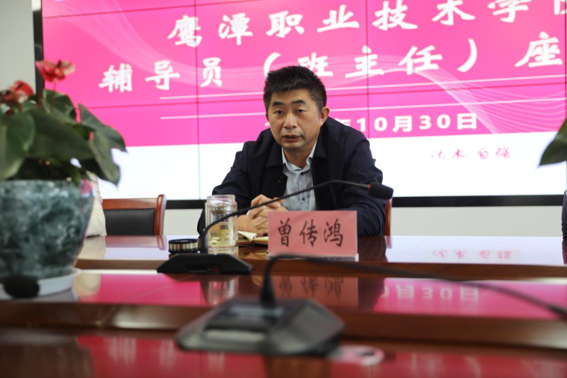 随后,院党委书记曾传鸿首先强调了辅导员(班主任)对学生的价值观、思想观、人生观正确引导的重要性,然后要求各位辅导员紧紧围绕“为什么做、做什么、怎么做”为主题开展工作,并引伸提出三个方面重要指示:一是要坚持“三多”+沟通,要“多学、多做、多走”,与学生、家长、任课老师沟通要到位;二是要坚持“三知”+帮助,一知学生在哪里,二知学生在干什么,三知学生需要什么,学生遇到困难要及时帮助,解决问题;三是要坚持“三心”+责任,对学生要有爱心、耐心、细心,工作中要勤于思考、善于发现,做一个有责任、敢担当的新时代辅导员(班主任)。